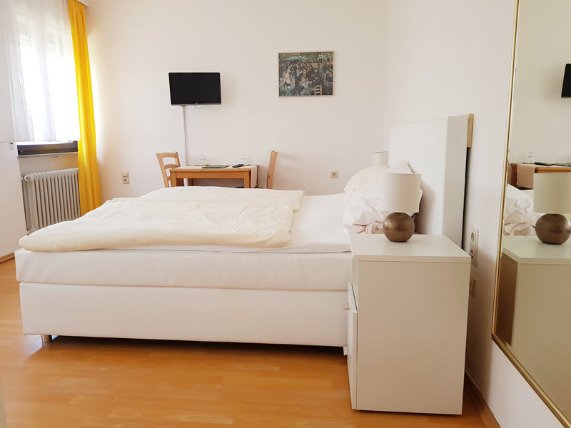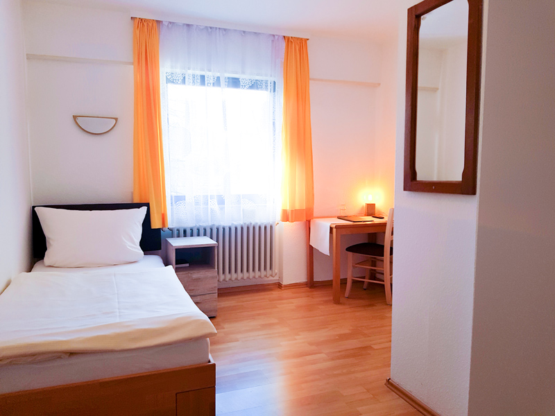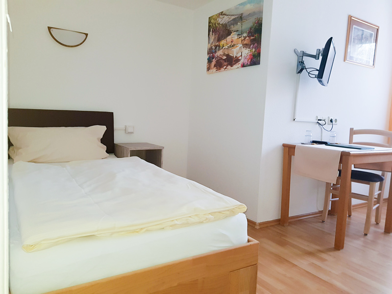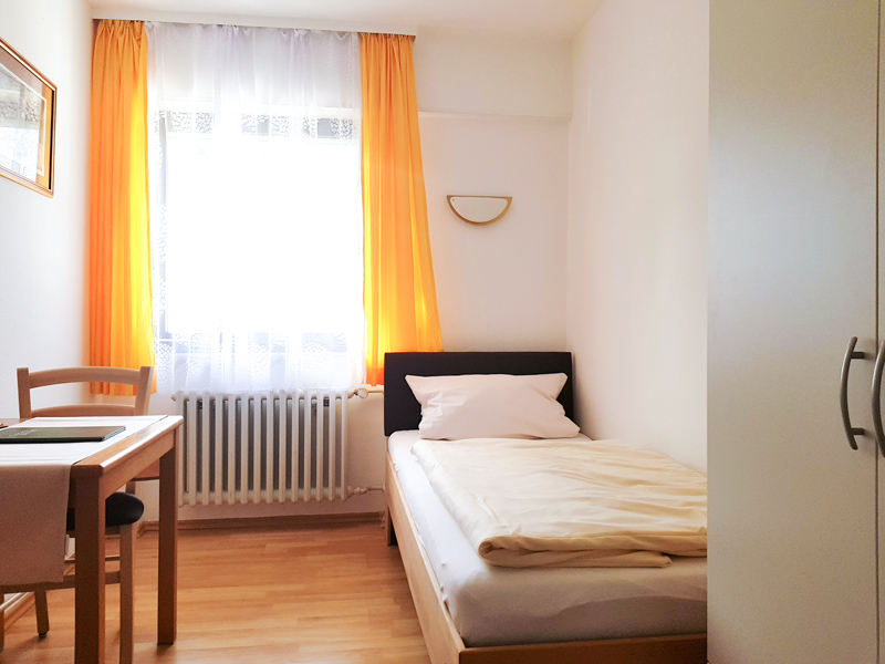 Zur Auswahl stehen je drei einfache Einzel- und Doppelzimmer mit Bad und WC oder Dusche und WC, die alle mit Frenseher, WLAN und einem Föhn ausgestattet sind. Zudem bieten wir Ihnen kostenlos Tee oder Kaffee an unserer Kaffeestation an, Sie haben Zugang zum Gästekühlschrank und zwischen 11 und 14 Uhr und ab 17 Uhr sowie sonntags durchgehend ab 11 Uhr erfüllt unsere Küche Ihnen gerne alle Wünsche.